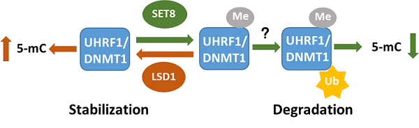 图注:SET8与LSD1动态调控DNMT1/UHRF1甲基化依赖的泛素降解从而影响DNA甲基化的调控机制模型