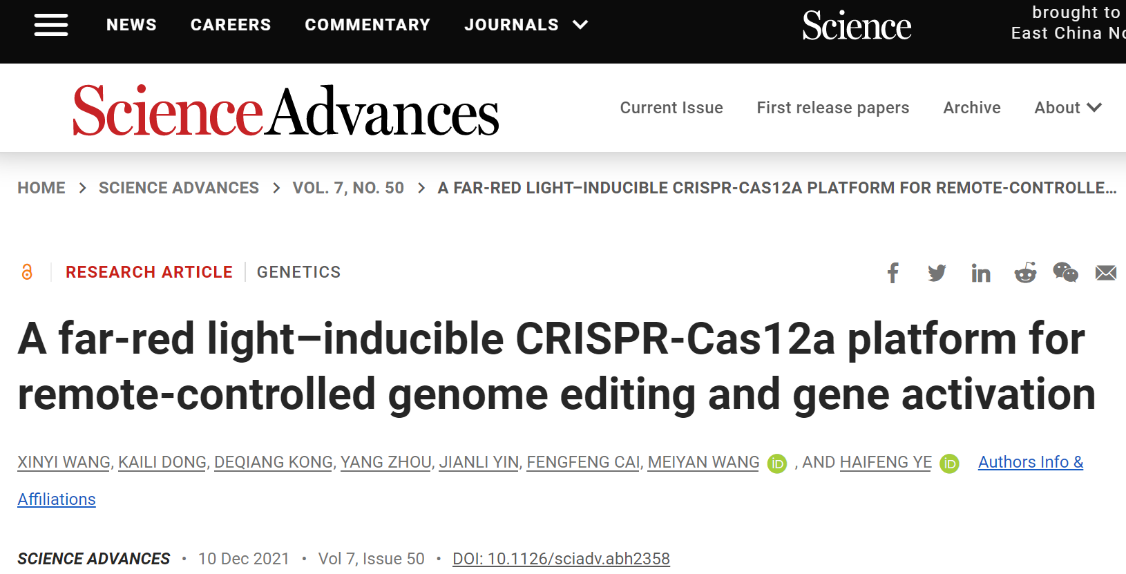 2021年12月10日,黄色网址 、上海市调控生物学重点实验室、华东师范大学医学合成生物学研究中心叶海峰课题组在国际著名学术期刊《科学—进展》(Science Advances)在线发表了题为 A far-red light–inducible CRISPR-Cas12a platformfor remote-controlled genome editingand gene activation 的研究论文,报道了一种远红光调控的基因编辑和表观遗传重塑的控制系统,为精准可控的基因编辑技术再添一员大将。这是继2020年7月开发的光控基因编辑工具FAST系统之后(Yuetal, Science Advances, 2020),开发的另一种全新版本。